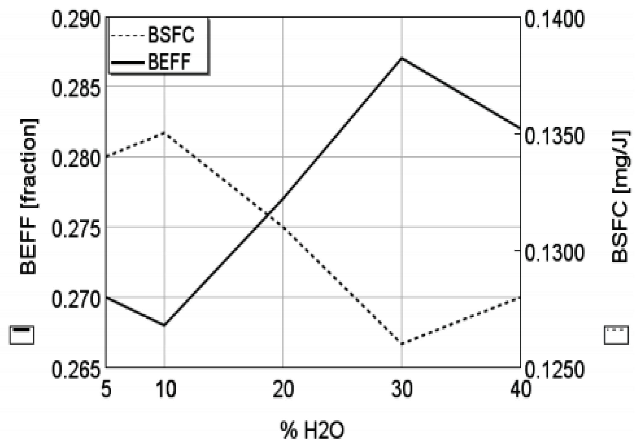 Furthermore, Lanzanova et al. [78] investigated the effect of water content (5% to 40% by volume)- ethanol blends in an Otto engine at maximum brake torque. The results revealed that the in-cylinder pressure was enhanced with the increase in water content in ethanol. By increasing the water content, advanced spark timing could be used without the occurrence of knock. The combustion duration was nearly unaffected with only an increase in ignition delay for up to 30% of water, it also found that until 30% of water content, by volume, is reached in ethanol, the engine burning rates remained almost constant, with this resulting in an increased brake thermal efficiency, brake mean effective pressure and a decreased brake specific fuel consumption (see Figure 6), these results attributed to the spark advance and its consequences in combustion as the water content increased.