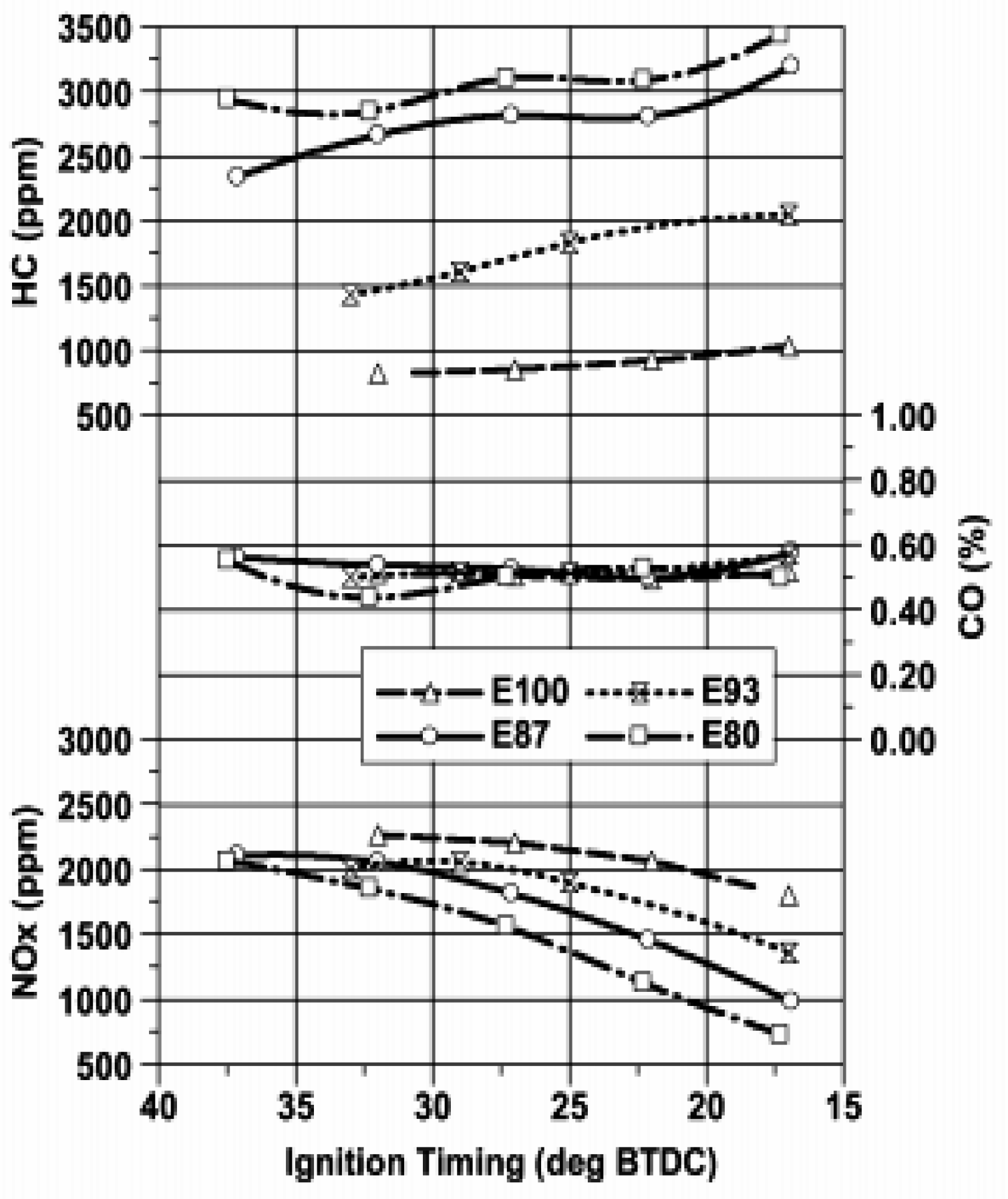 Experiments conducted by Liu et al. [49] investigated the emissions of HE10 hydrous ethanol gasoline blends and gasoline. The results showed that for hydrous ethanol blends CO and HC emission were lower for all loads, while NOX emissions were reduced for low load engine operation. At idling speed, the CO, HC and NOX emissions were all reduced. NO and NOX emissions were reduced for the use of hydrous ethanol gasoline blended fuel (HE40).While, the HC, CO and CO2 emissions showed a small reduction for the use of hydrous ethanol containing fuels compared with gasoline [50]. The higher latent heat of evaporation of the ethanol blends, and water present in it resulted in lower in-cylinder temperature, which in turn resulted in lower NOX emissions (see Figure 7). HC emission was also lower for HE10 at 25% throttle opening, which was due to the presence of oxygen in the fuel and a better combustion rate [67]. Brewster et al. [79] investigated a spark ignition turbocharged engine fueled by anhydrous (El00) and hydrous (E93W7, E87W13, E80W20) ethanol fuels. The results showed that the emission of CO was unchanged by the water content in ethanol, with a NOX emission reduction with an increase water content in ethanol at a fixed ignition timing, the key is the existing water, which lowers the peak temperature during burning and slows down the procedure of NOX formation. For similar operating conditions, there was an increase in HC emissions with an increase in water content for the E93W7and E87W13 fuels may be resulted in incomplete combustion, the trend being largely independent of ignition timing (see Figure 8).