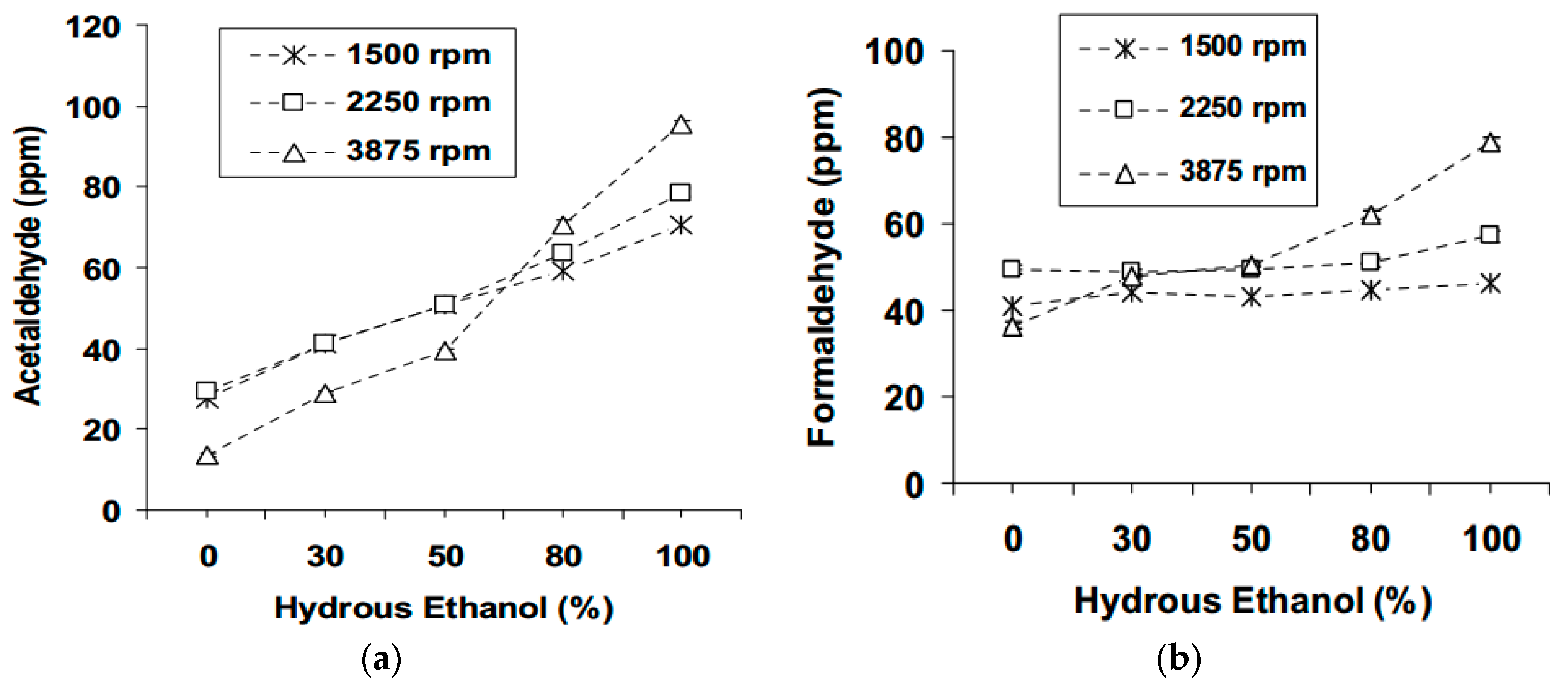 A number of publications [8,39,80,88] have reported that acetaldehyde and formaldehyde emissions from hydrous ethanol fuel increased in comparison to the use of gasoline. This includes a study conducted by Clemente et al. [8] which concluded that the aldehyde from hydrous ethanol was higher than that for gasohol by 58%. Another interesting study was published by Melo et al. [42]. The results showed a significant increase in both acetaldehyde and formaldehyde as hydrous ethanol percentage, by volume, increased for all engine operating points (see Figure 9).