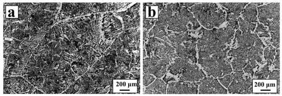Figure 6a,b shows the SEM images of the low-carbon steels casted with the respective addition of NbC and NbC–Fe having the same amount of NbC (0.15 wt %), in which the NbC powders were electrochemically produced from Nb2O5 at 900 °C with a constant voltage of 3.0 V for 10 h. It was found that the NbC particles could not disperse uniformly in the casted sample, because of its unsatisfactory wettability with respect to the steel. NbC particles aggregated together seriously in the casted sample. Reversely, the Fe shell outside the carbide effectively improved this deficiency. As shown in Figure 6b, the distribution of the carbide particles is clearly uniform in spite of the fact that they are mixed into the steels under the same conditions.