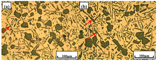 Figure 1 shows the typical microstructures of Al–18Si alloys with different melt treatments by using Al–29Ca and Al–6Y–2P master alloys. It is well known that the coarse primary Si with an average size even up to 100.0 μm could deteriorate the mechanical properties of Al–Si alloys and must be effectively refined. With the addition of 0.2% Al–29Ca master alloy, the primary Si can be modified to about 32.1 μm, but still presents irregular morphologies, such as polygon, as is illustrated in Figure 1a,b. Furthermore, it can be found that the eutectic Si were not efficiently modified and some coarse flaky eutectic Si were observed, as indicated by red arrows in Figure 1a,b. By comparison, the primary Si in Al–18Si alloys can be obviously refined with the addition of 1.5% Al–6Y–2P master alloy. The average size of primary Si has decreased to about 17.6 μm with the distribution being improved simultaneously. It was worth noting that there were some black particles that were embedded in primary Si act as the heterogeneous nuclei as circles shown in Figure 1c,d, which could be deduced to be AlP according to previous studies [23].