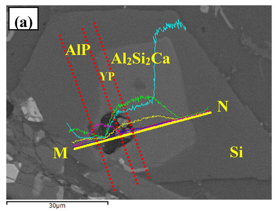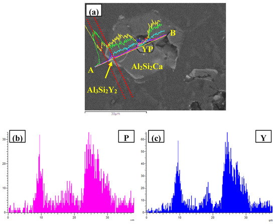 The FESEM micrographs and EDS line scanning alalysises along A and B were present in Figure 11. In the center of composite particle, a compound with the enrichment of Y, P, and Owas observed, and trace Al element was also detected. According to our previous work [24], the structural evolution of YP in Al–Si melt can take place as follows . Meanwhile, the enrichment of element O might be caused by the oxidation and hydrolysis of phosphides (YP and AlP) during the specimen preparation process. Based on this, the particles in the center part of multi-encapsulation structure can be deduced to be phosphides (YP and AlP). The hexagonal compound surrounded YP and AlP was proved to be Al2Si2Ca due to the enrichment of Al, Si, and Ca elements. In addition, the outmost thin phase that was highlighted by red dashed lines in Figure 11a was composed of Al, Si, P, and Y elements. Therefore, this compound can be deduced to be Al3Si2Y2, with solid solution of P element. As concluded above, the inner center of multi-encapsulation structure could be YP and/or AlP, which were encapsulated by Al2Si2Ca and Al3Si2Y2 from inside to outside in order.