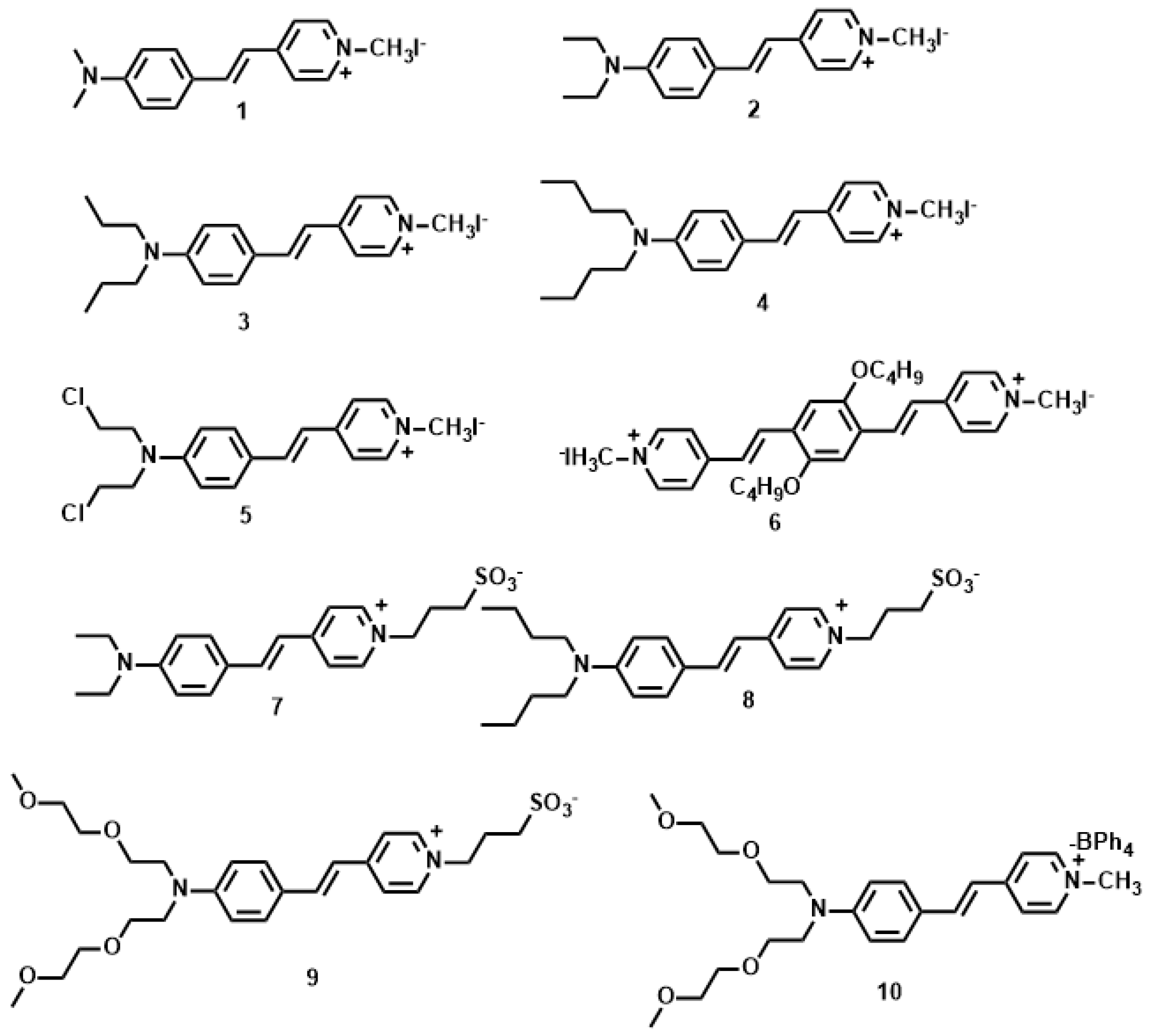 The δ values of the pyridinium derivatives (1–10) [53,54,55,56,57] increased as the conjugation length was increased by styryl groups, reaching the maximum δ value of 309 GM for 6 and the minimum δ value of 14.8 for 5 (Figure 3, Table 1). When the conjugation length was increased by a styryl group (6 vs. 1–5, the δ value increased more than three-fold. The molecular structures indicated that 1–5 are D-π-A dipoles, whereas as 6 is a A-π-D-π-A quadrupole. δ changes little due to the similar donor ability when the donor was changed from Me to n-Bu group (1–4, 7 and 8). Whereas the OC4H9 group in the core increase δ value significantly, presumably due to the auxiliary electron donating property leading to enhanced ICT. On the other hand, Cl atom at the terminal position signicantly decreased δ values (5 vs. 1–4 and 6), indicating the importance of donating ability in two-photon materials. From 7 to 9, the growth of the alkyl chain increases the electron density of the bridge, favoring the ICT along the extended π-bridge from terminal donor to acceptor group. In the case of 9, the presence of two methoxyethoxyethyl groups enhances the steric bulk which can hinder π-π stack. Therefore we inferred that not only the electron donating ability of the terminal group impacts the 2PA behavior but the steric bulk as well, that is to say, the steric bulk of the electron-donating terminal group plays a major role in 2PA behavior. As observed for sulfonate salts, the δ value increased with the accepting ability compared to methyl pyridinium. (2, 4 vs. 7, 8). The δ value of 10 was four times larger than that of sulfonate salts when the accepting ability of the terminal group was further increased by the stilbazolium group. This result shows the importance of strong ICT over a suitable donor, acceptor, and conjugated length to achieve a large two-photon cross section. Moreover, 9 shows δmax values above 100 GM by using the optical excitation wavelength at 960 nm, which are the most attractive features for its utility as a biological probe.
