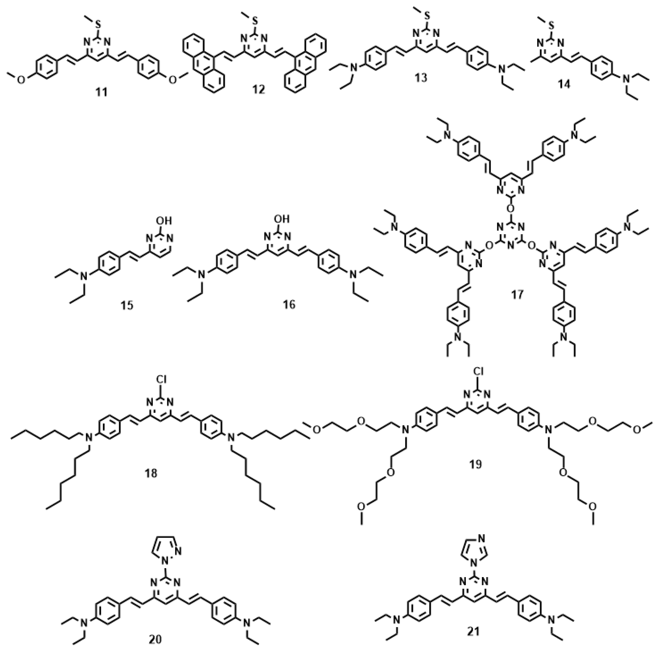 Pyrimidine derivatives were intensively investigated as electron luminescent materials in the past [58,59] owing to the π-electron deficient and planarity they provide. The compound 4,6-dimethylpyrimidine was selected as the central unit, which allows tuning of the electronic delocalization along the conjugated backbone in the ground state by modulation of the twist angle between the two halves of the molecules [60].
