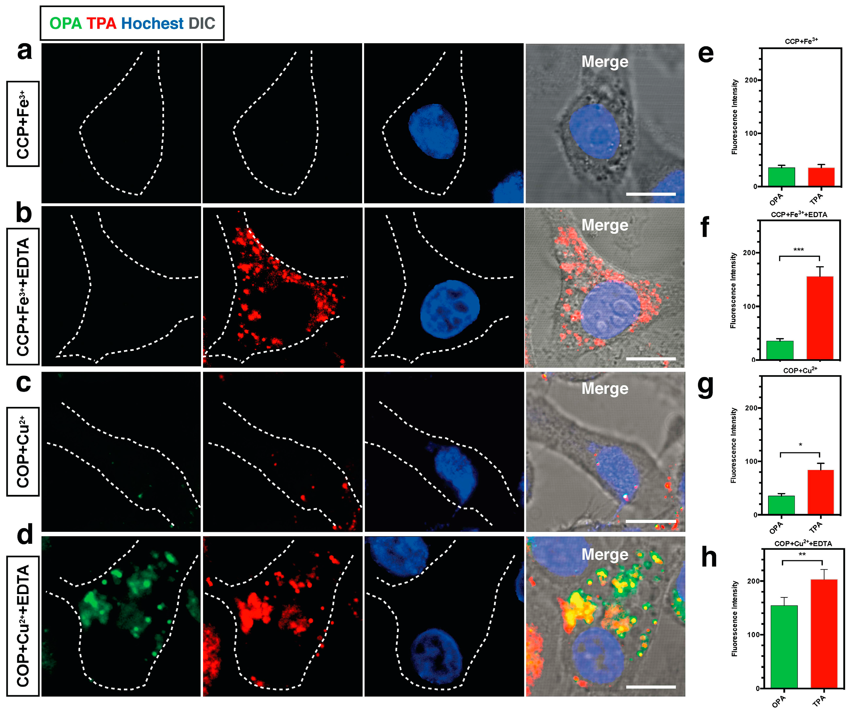 (a) One and two-photon florescence image of HepG2 cells with 18 in the presence of Fe3+ (λex = 840 nm, emission wavelength from 575 to 675 nm); (b) One and two-photon florescence image of HepG2 cells with 18 in the presence of Fe3+ and EDTA (λex = 840 nm, emission wavelength from 575 to 675 nm); (c) One and two-photon florescence image of HepG2 cells with 19 in the presence of Cu2+ (λex = 820 nm, emission wavelength from 575 to 675 nm); (d) One and two-photon florescence image of HepG2 cells with 19 in the presence of Cu2+ and EDTA (λex = 820 nm, emission wavelength from 575 to 675 nm); (e–h) Normalized fluorescence intensity analysis corresponding to (a–d), cell number n = 30, one-way ANOVA was used for statistical analysis for independent experiments, p < 0.005.