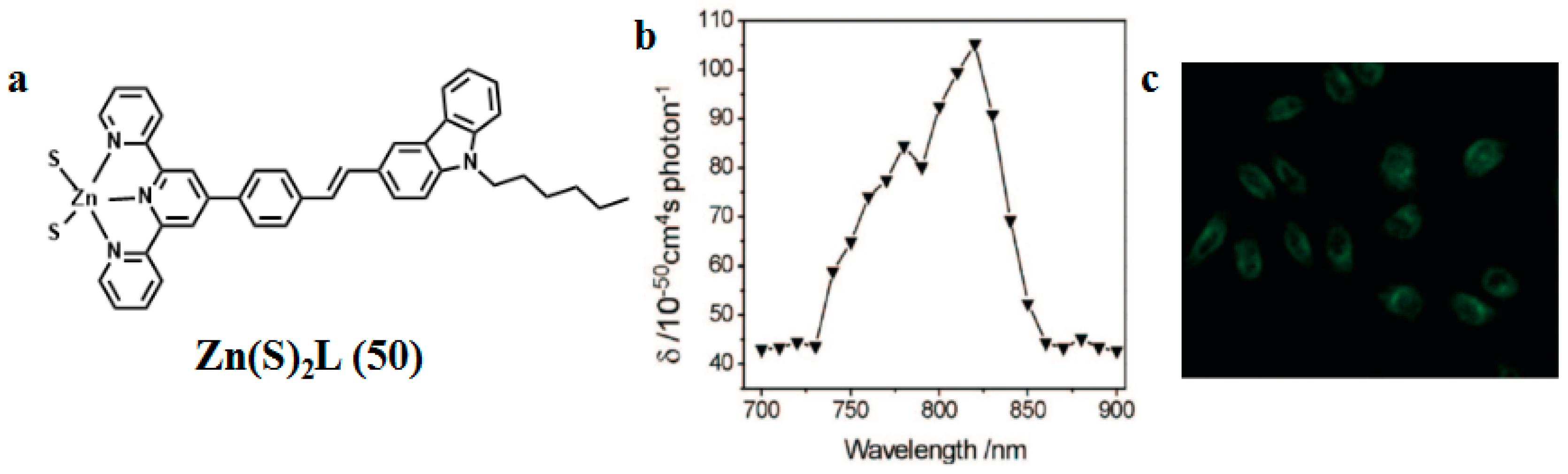 In 2009, we utilized a facile solvothermal reaction process toward the target Zn(II) complex. ZnS nanocrystals were used as both a zinc source and sulfur source [96]. The selected bulky organic ligand was N-hexyl-3-{2-(4-(2,2′:6′,2″-terpyridin-4′-yl)phenyl)ethenyl}-carbazole (labeled as L in Figure 7). The bulky L is a highly π-conjugated chromophore, which contains a terpyridinyl tridentate chelate group [97], a two-photon active carbazole moiety [98], a flexible hexyl chain, and a phenylethenyl group as a π-conjugated bridge. Significantly, the two sulfur atoms in the complex are identical in the minus one oxidation state (S1−) and coordinated to Zn(II) as terminal ligands, which was unknown previously in Zn(II) complexes. The unique feature in this new reaction design is the use of ZnS nanocrystals as a precursor and chromophoric L as an ancillary ligand. In the measured range (700–900 nm), the maximal 2PA cross section (δ) is 105.2 GM at 820 nm, which is suitable in the biological field. Two-photon fluorescence microscopy (2PFM) confirmed that the molecules of Zn(S)2L (50) are presented within the cells, the cytoplasmic distribution is more uniform, and the distribution in the nucleolus is significantly lower. This result demonstrates that the observed cytoplasm uptake must be due to the presence of the intact Zn(S)2L (50) complex. Thus, the novel structural mode of the Zn(S)2L complex and its 2PEF imaging should be intrinsically interesting to chemists, biologists, and material scientists. Particularly, the versatility of the two unsaturated coordinated sulfur atoms could be expected to endow Zn(S)2L (50) significant promise not only for biomedical applications but also as a “complex” ligand for the surface modification of nanomaterials, even for the synthesis of novel hetero metal complexes.