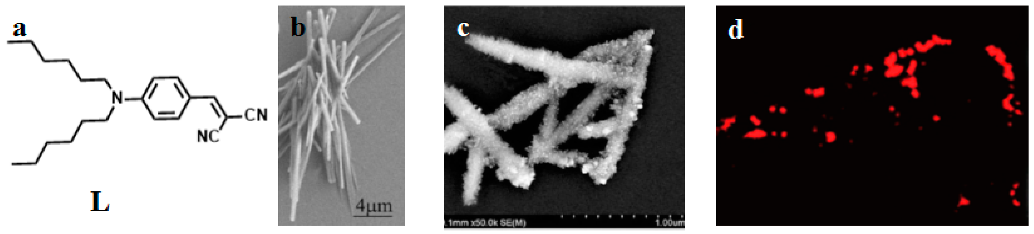 (a) Schematic representation of L; (b) SEM (Scanning electron microscope) micrograph of L nanorods prepared from EG (ethylene Glycol) solution; (c) SEM micrograph of the nanohybrid (53); (d) Two-photon fluorescence Image of HepG2 cells incubated with 20 μm of 53 for 30 min, then washed with PBS. λex = 760 nm (emission wavelength from 520 to 562 nm).