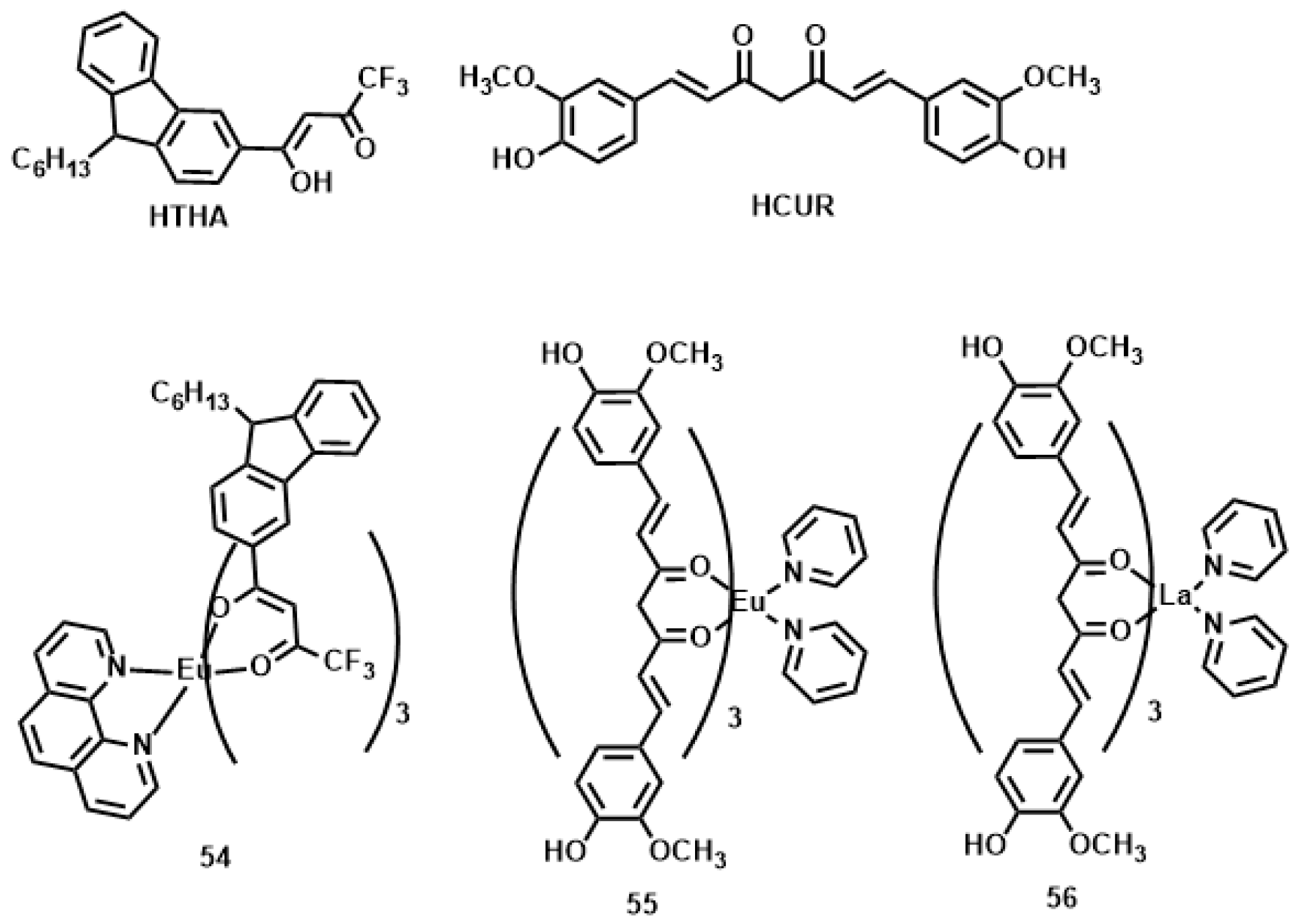 The structures of ligands HTHA (4,4,4-trifluoro-1-(9-hexylcarbazole-3-yl)-1,3-butanedione) and HCUR (1,7-bis(4-hydroxy-3-methoxyphenyl)-1,6-heptadiene-3,5-dione) and its rare earth complexes 54–56.