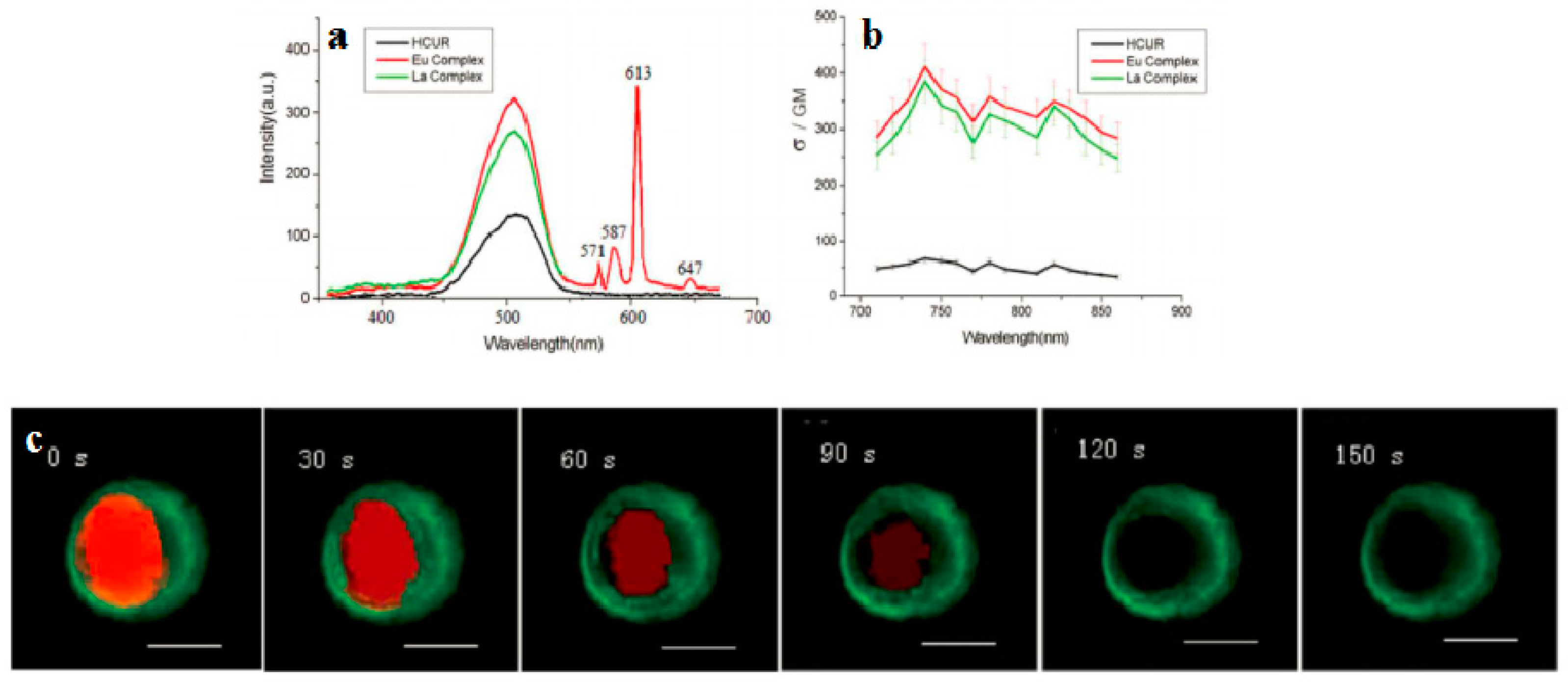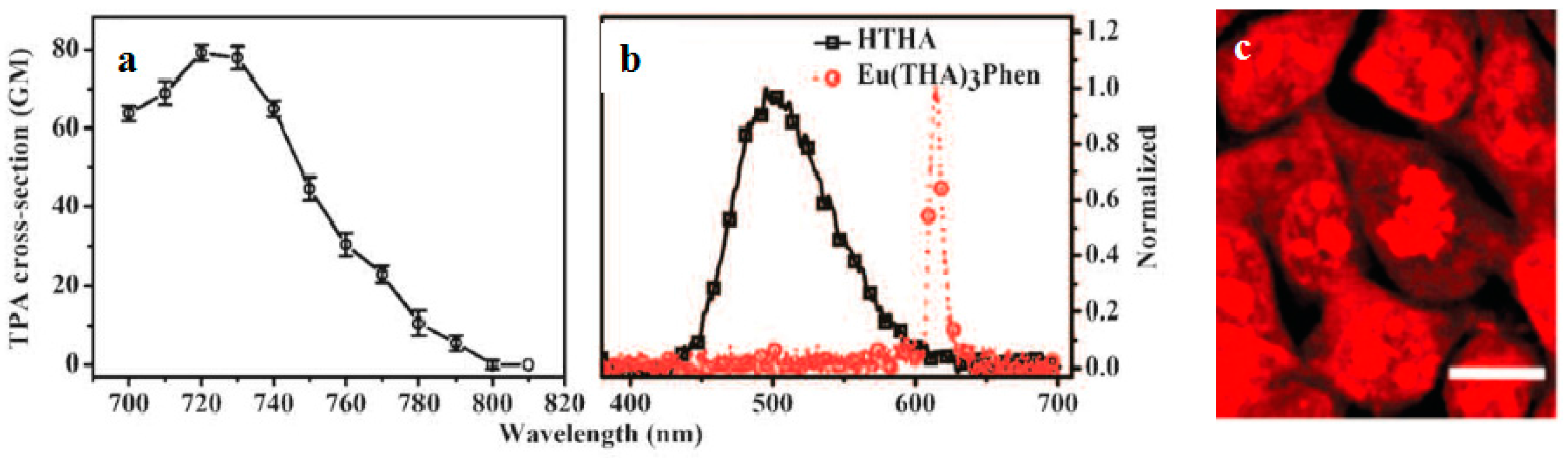 (a) 2PA cross sections (δ) for Eu(THA)3Phen (54); (b) Two-photon-excited fluorescence (2PEF) of HTHA and Eu(THA)3Phen (54) in DCM (1 × 10−3 mol·L−1); (c) Live cellular image based on Eu(THA)3Phen (54), MCF-7 cells were incubated with 200 μM complex for 1 hour, then imaged by two-photon microscopy (excitation wavelength λ = 770 nm, emission wavelength λ = 613 nm) without fixation. Note that cell cytosol staining is clearly emerging in higher concentration; in contrast cell nucleus and nucleoli luminescence is more significant in low concentration. All the scale bars represent 10 mm.