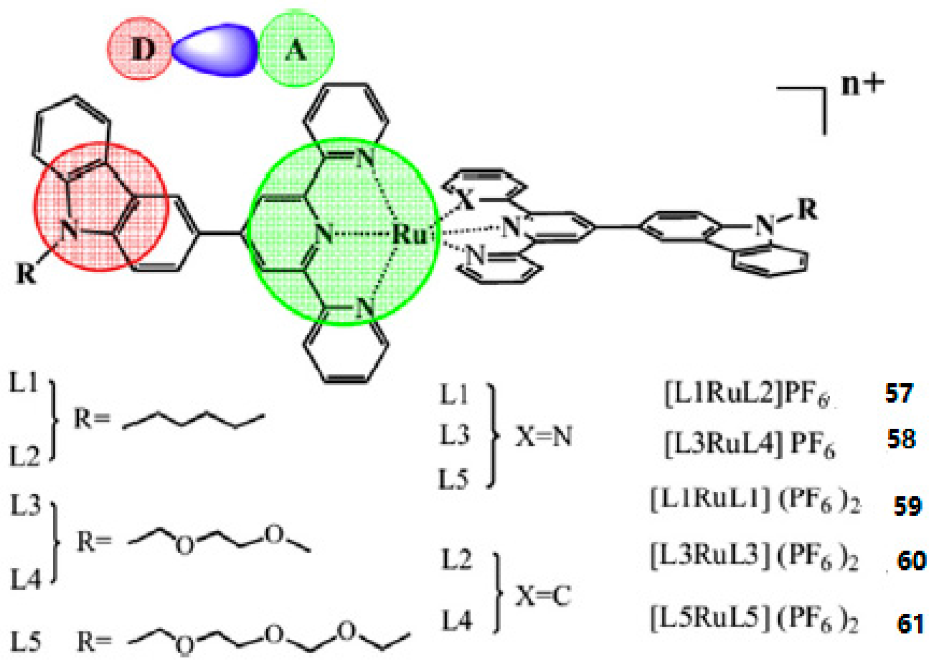Based on the above information, Xiao et al. reported five novel Ru (II) polypyridyl complexes (57–61) (Figure 14) [135] based on donor-acceptor (D-A) ligands, in which the 2,2′:6′,2″-terpyridine or 6-phenyl-2,2′-bipyridine acts as acceptor units (A) and a carbazole moiety as a donor group (D). The alkyl or alkoxy as the auxiliary group connecting to the N atom of the carbazole is to improve the solubility of the metal complexes. The 2PA properties of the complexes were measured by Z-scan techniques and the interaction with DNA by use of optical spectroscopic and viscosity measurements. Table 6 shows the third-order nonlinear parameters of the five complexes, the δ values of the complexes 1–5 exhibits the order of 59 < 60 < 61 < 57 < 58.