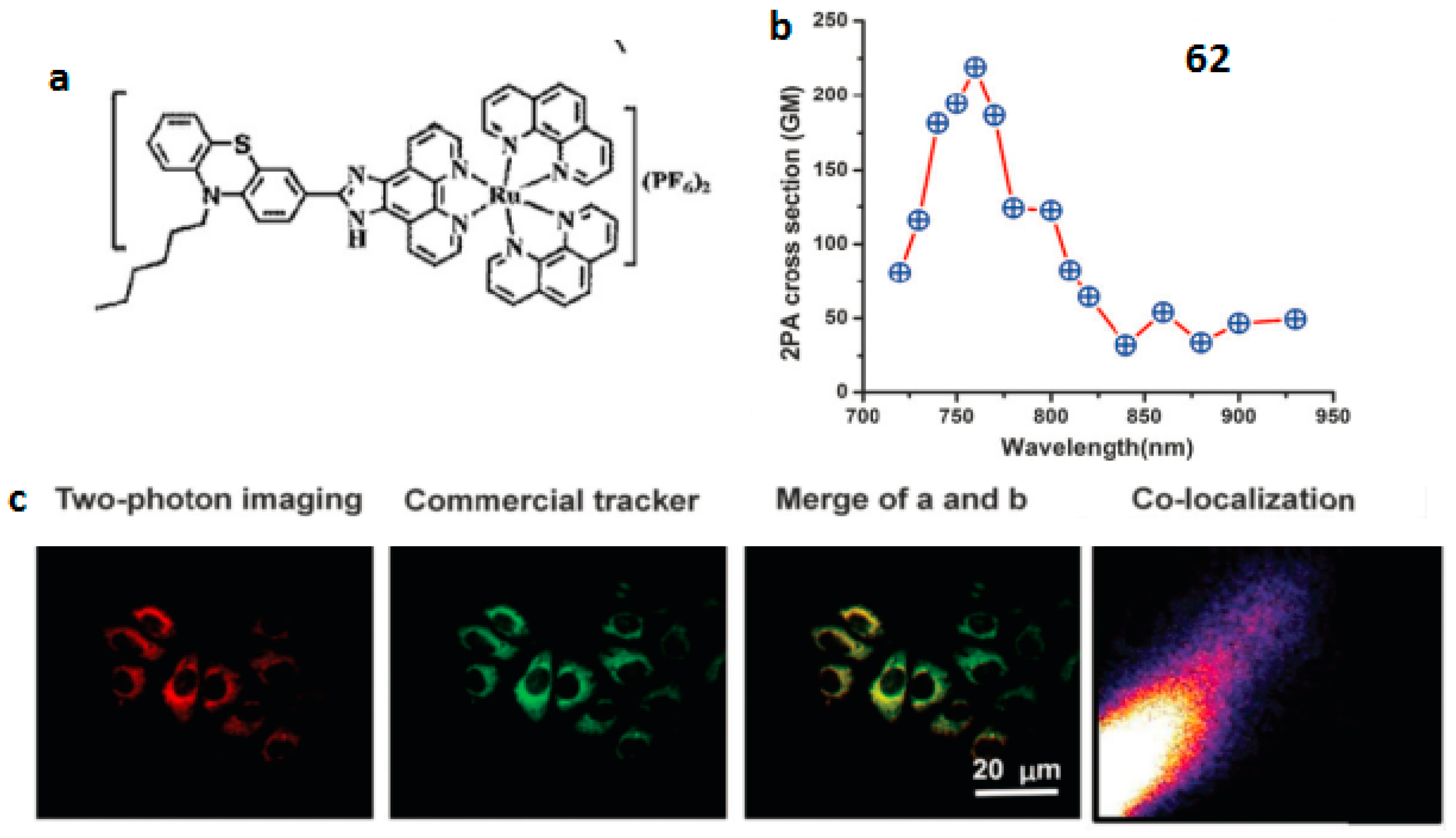 (a) Molecular structures of 62; (b) 2PA cross-sections of 62 in DMSO (dimethylsulphoxide) solution (c = 1 × 10−3 mol·L−1); (c) 2PFM of HepG2 cells co-labeled with 52 and Mitotracker.