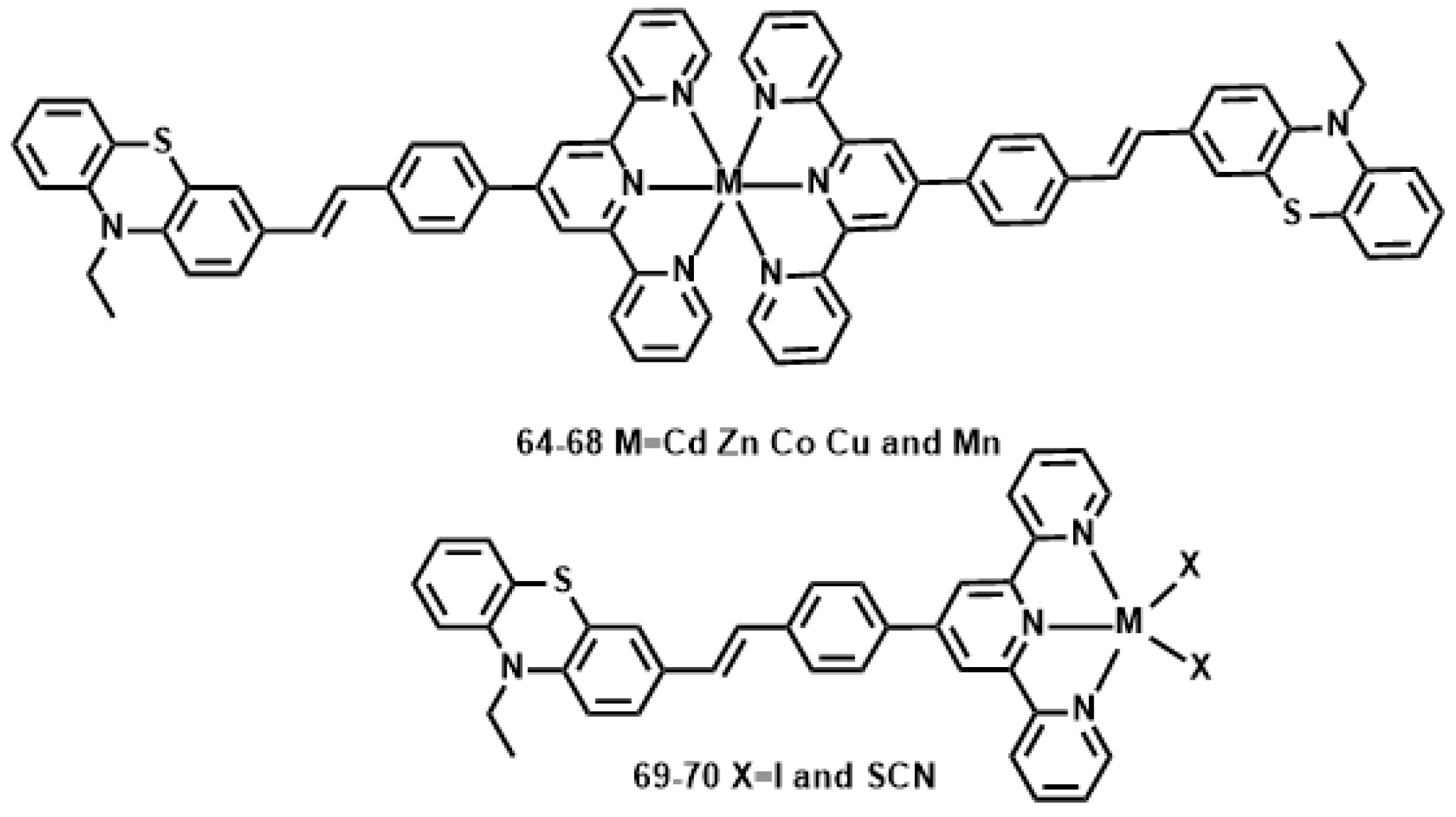 Li et al. reported a novel 10-ethyl-3-[4-(2,2′:6′,2″-terpyridinyl-4′-yl) styryl] phenolthiazine (L) (Figure 17) [144], with the styryl moiety as the π-bridge; the tpy unit, tridentate ligand, can easily coordinate to various metal ions. The metal-ion binds to the acceptor, forming a D-π-A motif ligand, rather than a donor site, it should yield an increase rather than decrease of intraligand charge transfer (ICT) upon excitation. Different metal ions can influence the structures and photophysical properties of resulting complexes to a large extent, which is expected to result in an increased δ and enhanced fluorescence brightness. Their 2PA properties in DMF were studied using the Z-scan method. Considering the molecular weight difference between the complexes and free ligand, the 2PA cross-section values for all the complexes are approximately 2.4- to 3.6-fold larger than that for L (Table 7). Generally, the different metal centers are responsible for the different 2PA properties of the complexes. The δ values of the complexes 64–68 exhibit the order of 68 < 66 < 67 < 64 < 65. Another factor for the larger δ of 65 and 66 compared to those of 66–68 is attributed to the closed-shell d10-metal centers being non-detrimental to fluorescence. Considering each complex molecule of 64–68 contains two ligand molecules, it is slightly surprising that 64–68 (with two ligands L) has such similar values to 69 and 70 (one ligand L).