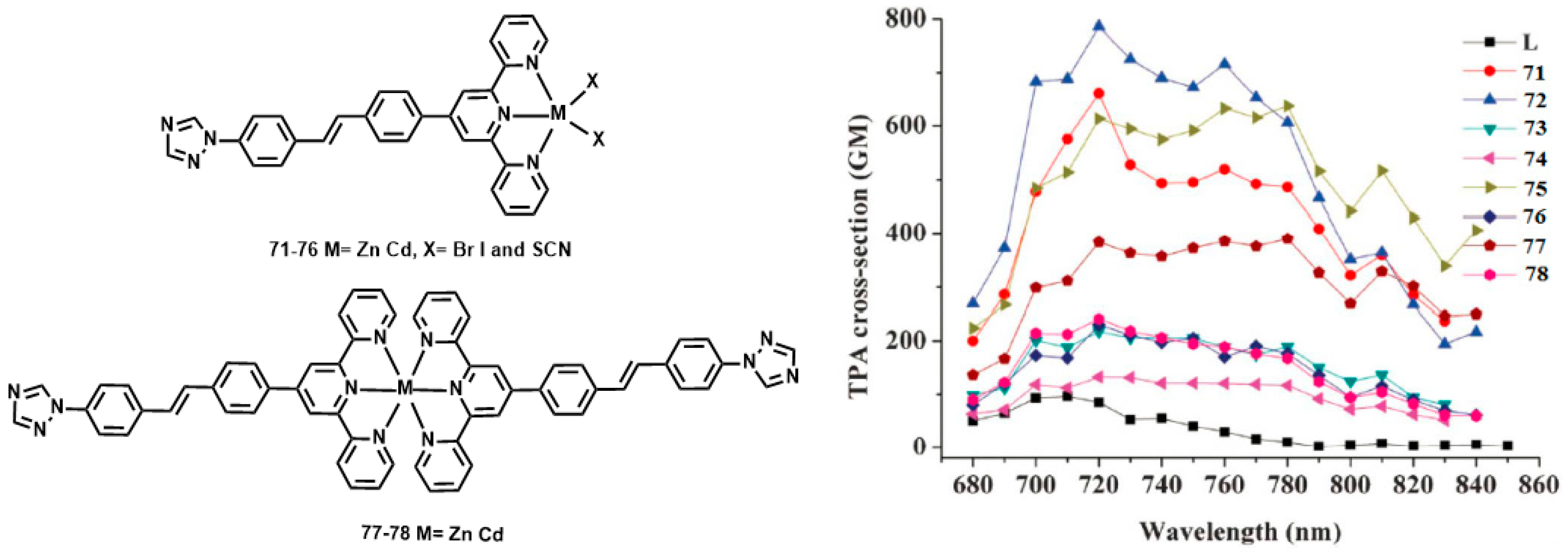 Of late, Zhou et al reported another novel D-π-A type ligand 4′-(4-[4-(1H-1,2,4-triazolyl)styryl] phenyl)-2,2′:6′,2″-terpyridine (L) and its six halogen Zn(II) and Cd(II) complexes 71–78 (Figure 18) [145]. The 2PEF experimental results reveal that 2PA cross-sections of these complexes are extraordinarily larger than that of the ligand, with maximum values of 97, 661, 787, 218, 133, 613, 230, 384, and 241 GM for L and complexes 71–78 in DMF, respectively. Density functional theory (DFT) calculations were performed on 71–78 and revealed that the halogen affects the accepting capability of surrounding metals due to different electron inductive effects, in the order Br > SCN > I. Thus, this in turn affects the 2PA cross-section values. The results indicate that the 2PA cross sections vary in the order Br > SCN > I, which is consistent with the experimental results.