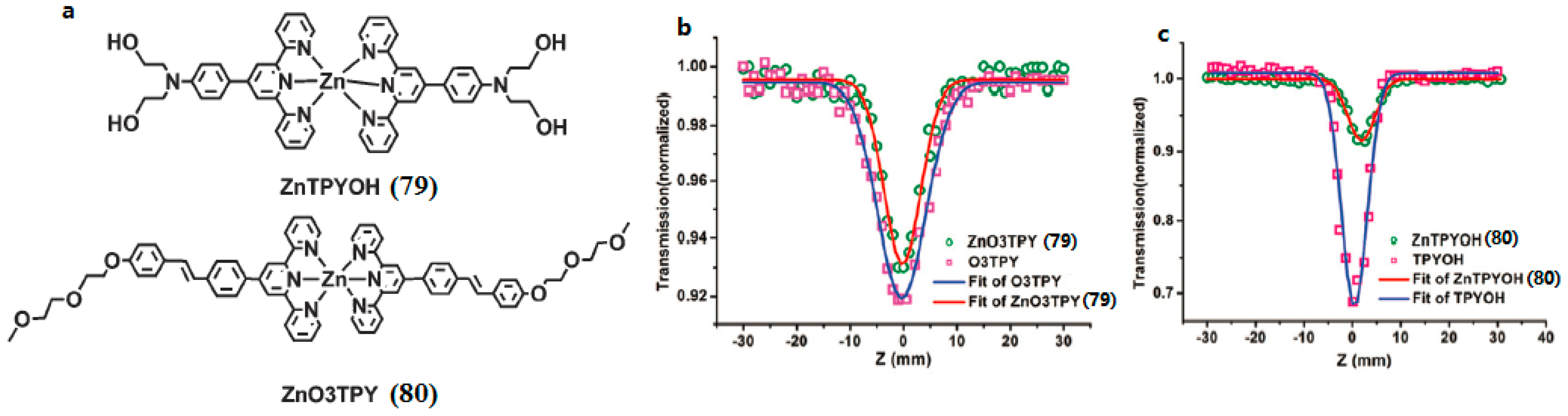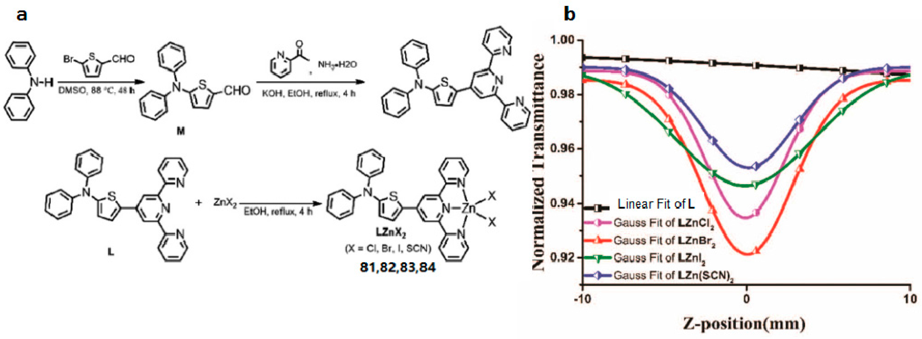 - Tan, J.Y.; Li, R.; Li, D.D.; Zhang, Q.; Li, S.L.; Zhou, H.P.; Yang, J.X.; Wu, J.Y.; Tian, Y.P. Thiophene-based terpyridine and its zinc halide complexes: Third-order nonlinear optical properties in the near-infrared region. Dalton Trans. 2015, 44, 1473–1482. [Google Scholar] [CrossRef] [PubMed]