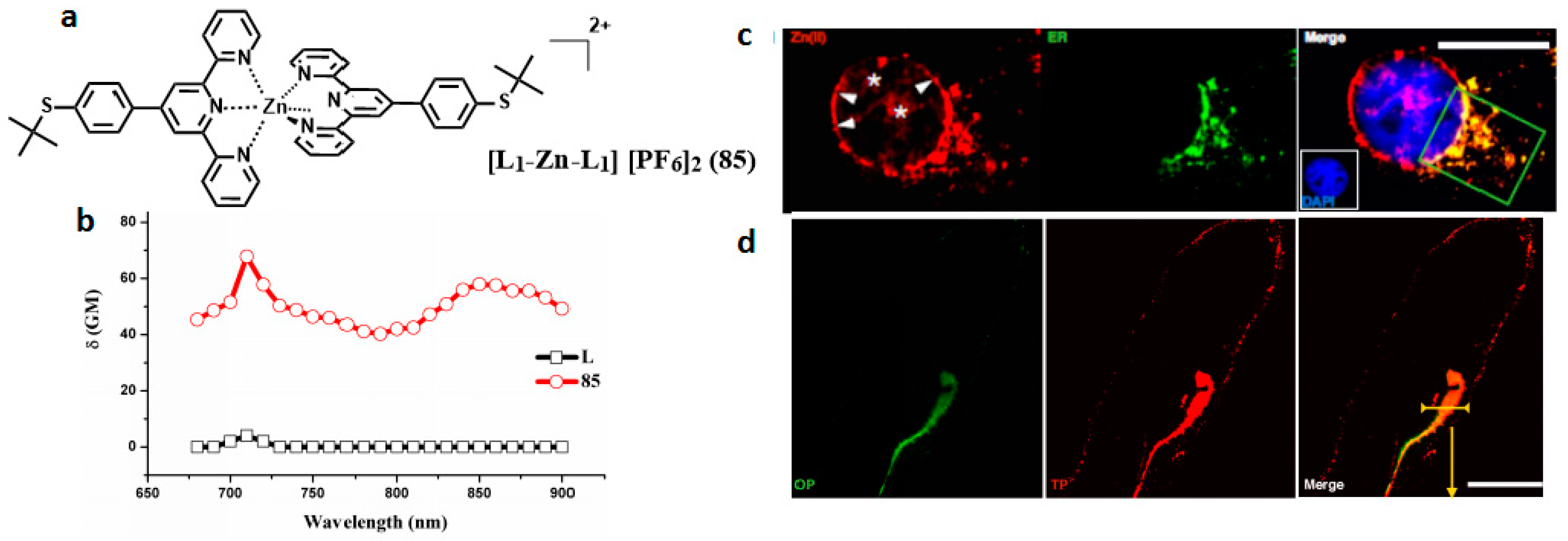 - Shi, P.F.; Jiang, Q.; Zhao, X.S.; Zhang, Q.; Tian, Y.P. Study of the one-photon and two-photon properties of two water-soluble terpyridines and their zinc complexes. Dalton Trans. 2015, 44, 8041–8048. [Google Scholar] [CrossRef] [PubMed]