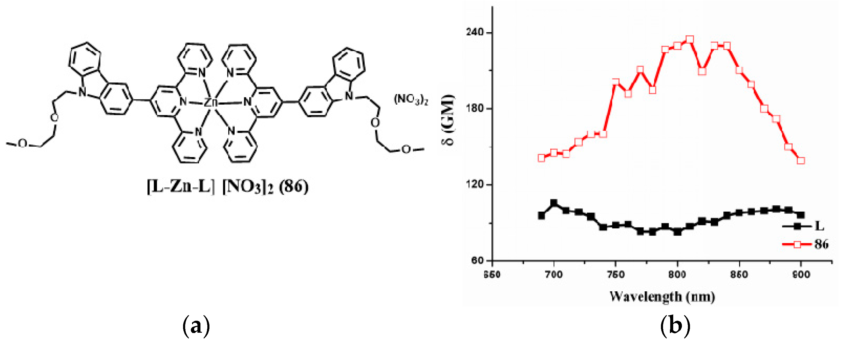 Polypyridyl ligands occupy a central position in modern coordination chemistry. Indeed, 2,2′-bipyridine has been described as ‘‘the most widely used ligand’’ [142]; its transition metal complexes are ubiquitous, whilst the terdentate analogue 2,2′:6′,2″-terpyridine (tpy) is not far behind [143]. Complexes of these ligands typically have high stability with respect to metal ion dissociation, owing to the synergistic combination of σ-donating nitrogen atoms and π-accepting heterocycles coupled with the favorable formation of five- and six-membered chelating rings. Moreover, the same properties help to ensure that polypyridine complexes absorb light and sometimes emit in the visible region. Typically, these metal complexes possess multiple transitions such as metal-to-ligand charge transfer (MLCT) and ligand-to-ligand charge transfer (LLCT) in the visible region. The binding of protons or cations perturbs the charge density in the binding unit and subsequently induces optical signal switching between different energy states to achieve the desired optical responses. However, it is still a challenge to design and synthesize a series of metal complexes especially transition metal complexes with low molecular weight, high water-solubility, biocompatibility, and large 2PA cross sections in the near infrared range (700–900 nm).