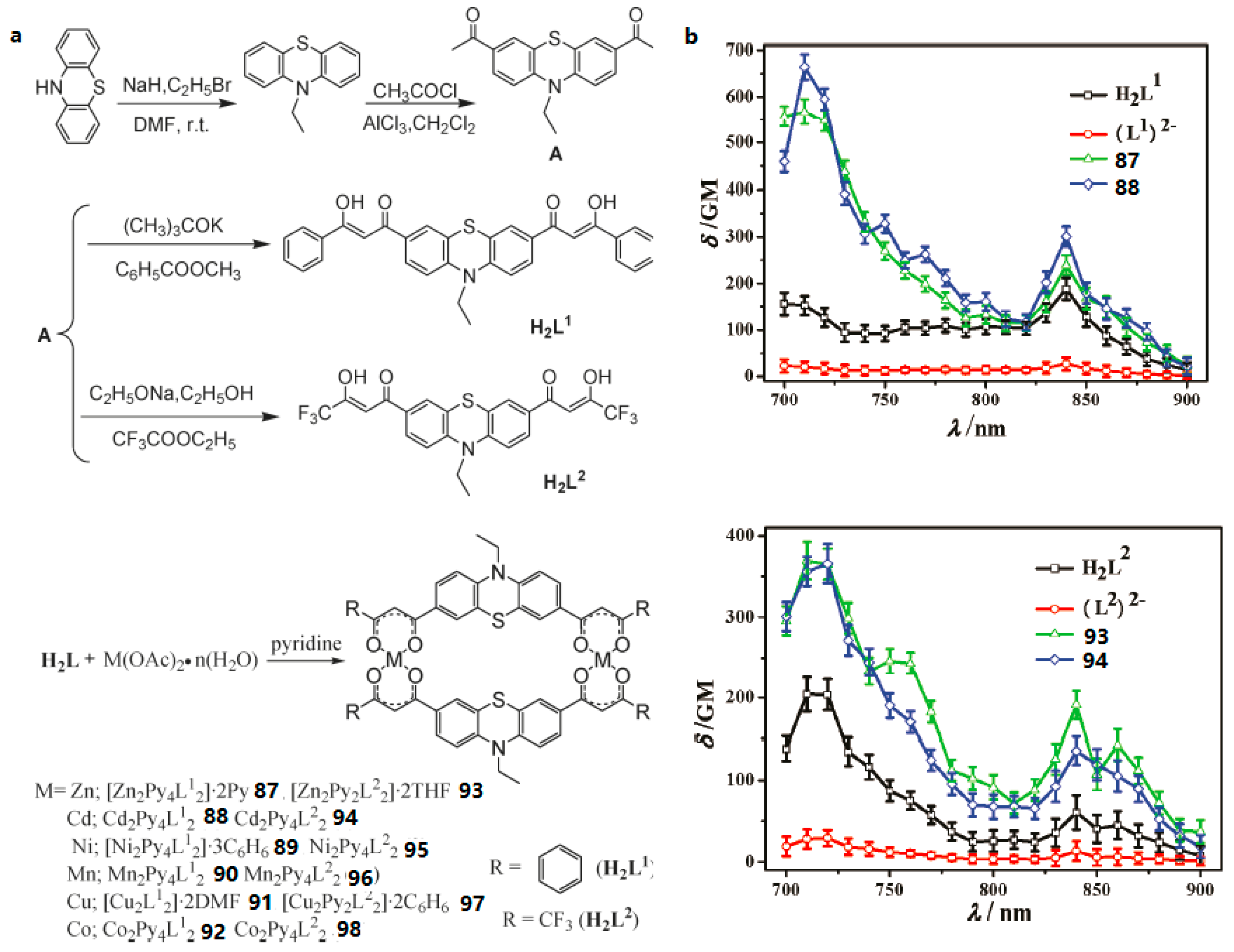 - Li, D.M.; Tian, X.H.; Hu, G.J.; Zhang, Q.; Wang, P.; Sun, P.P.; Zhou, H.P.; Meng, X.M.; Yang, J.X.; Wu, J.Y.; et al. Synthesis, Crystal Structures, Photophysical Properties, and Bio-imaging of Living Cells of Bis-β-Diketonate Phenothiazine Ligands and Its Cyclic Dinuclear Complexes. Inorg. Chem. 2011, 50, 7997–8006. [Google Scholar] [CrossRef] [PubMed]