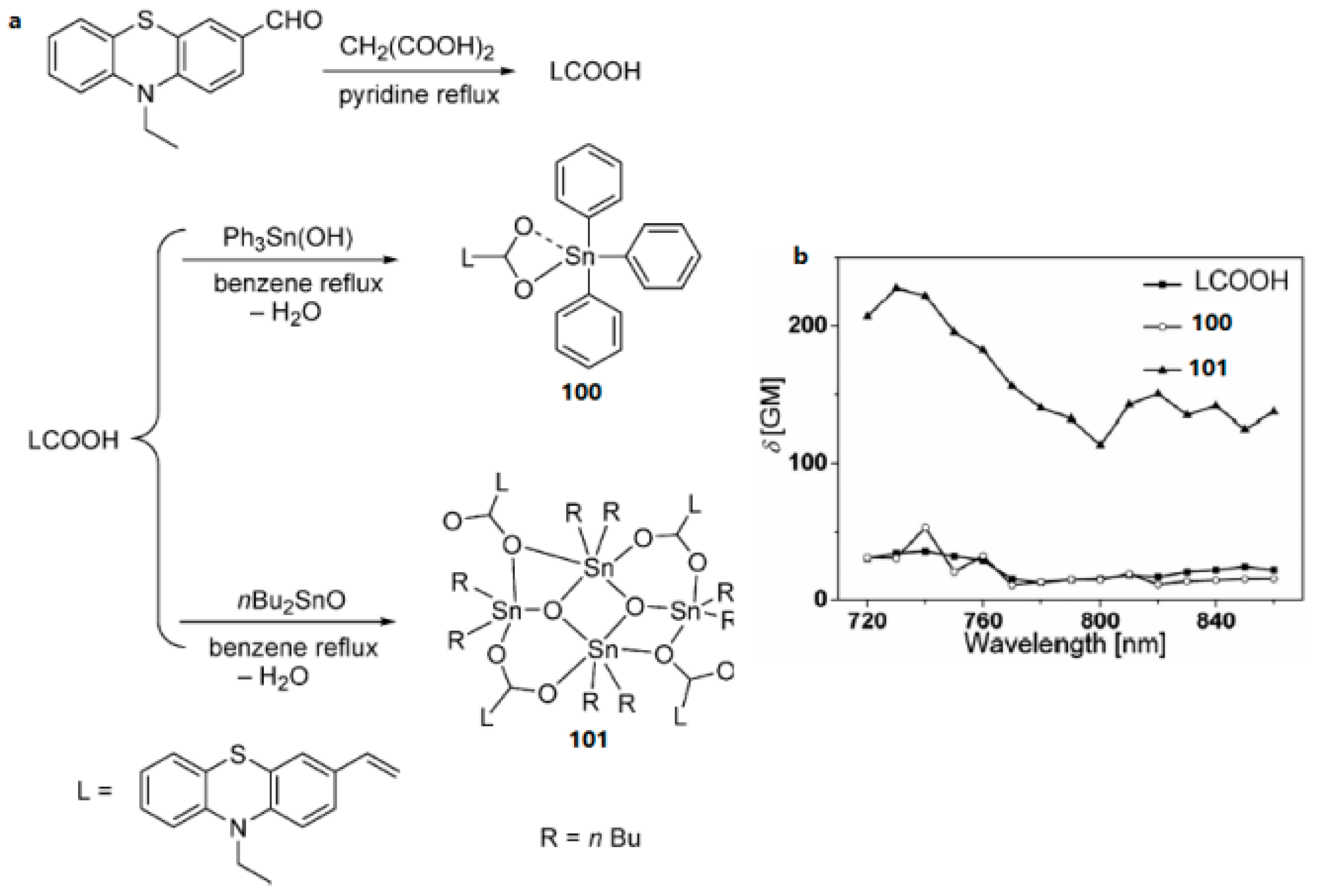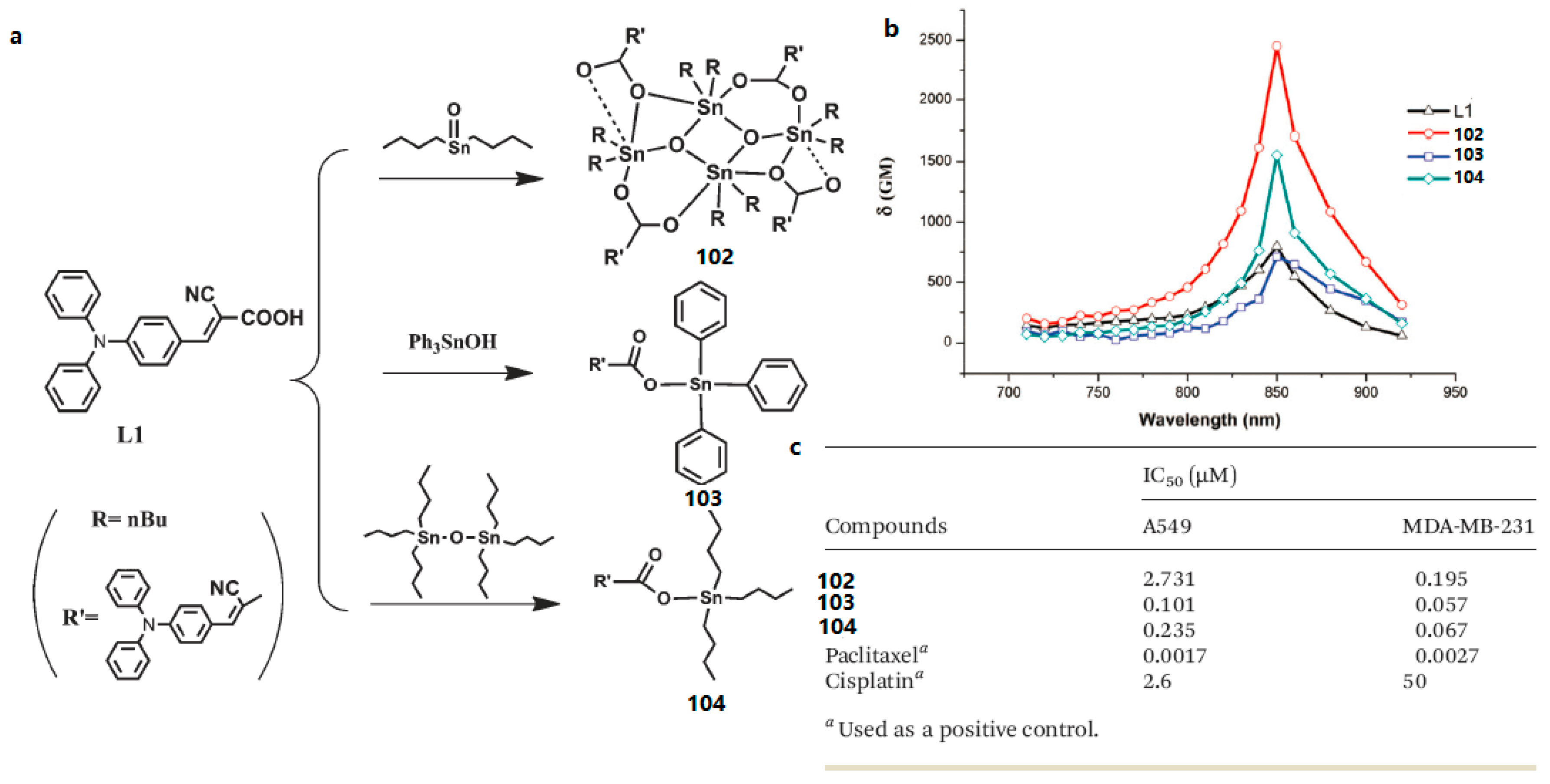 - Zhao, X.S.; Liu, J.; Wang, H.; Zou, Y.; Li, S.L.; Zhang, S.Y.; Zhou, H.P.; Wu, J.Y.; Tian, Y.P. Synthesis, crystal structures and two-photon absorption properties of triphenylamine cyanoacetic acid derivative and its organooxotin complexes. Dalton Trans. 2015, 44, 701–709. [Google Scholar] [CrossRef] [PubMed]