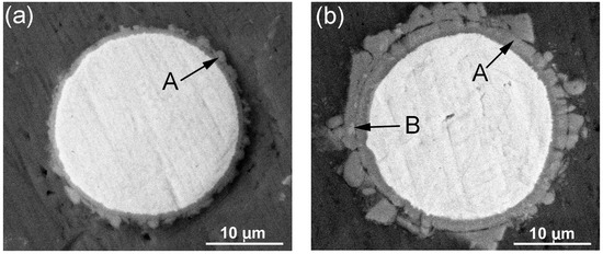At a given shell thickness, the reaction shells in the Al–Ti–Si system should be more compact than those in the other three systems due to the lower stress concentration in (Al,Si)3Ti and τ1 phases, and will become more and more compact with shortening heating time or increasing Si content because of the increased τ1 phase. As shown by Figure 7b, the reaction product in the 5.5 wt % Si-containing system heated for 10 min is a relatively compact shell, but as shown by Figure 4a, the shell have fractured into an agglomerate when the heating time increased to 30 min. It should be noted that the fracture is also partially contributed to the increased shell thickness. Increasing Si content not only thickens the shells, but also increases the proportion of τ1 phase. The former promotes the fracture of the shells, which can be verified by comparing Figure 7a,b, as described above, also can be seen through comparing Figure 4a and Figure 6a,b, the product in the 2 wt % Si system is in a quite compact shell, that in the 5.5 wt % Si alloy have fractured into the interconnected particles and the fracture degree became more serious when the Si content increased to 9 wt %. But, the latter improves the compactness, which can be confirmed by comparing Figure 6b–d, the shell for the 9 wt % Si system is quite compact, while those of the 5.5 wt % and 7 wt % Si systems contain cracks. It is just due to the obstacle of the compact shell to the reaction that the shell in the 9 wt % Si system is quite thin (Figure 7d). That is, decreasing the heating time and increasing Si content are beneficial to obtain compact reaction shells, but the former parameter and sometimes the later parameter all decrease the shell thickness. Therefore, to achieve the desirable core-shell-structured Ti@compoundp with a compact and thick compound shell, increasing Si content is generally helpful, but a suitable heating time must be coupled.