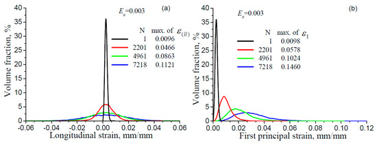 It needs to be pointed out that the strain contours are differently scaled and the plots cannot clearly visualize the changes from the 2nd to 2787th cycle. A quantitative evaluation of the strain distribution in the RVE and its change with cyclic loading is presented in Figure 4, showing the volume fractions of both the longitudinal strain and the first principal strain at the respective tensile peaks for increasing numbers of cycles number for different strain amplitudes ( = 0.003, 0.004, 0.005 and 0.006). The variation of strains in the RVE becomes larger and larger and the non-zero range expands with increasing number of cycles.