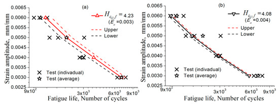 The curves and for each specified strain amplitude are shown in Figure 8a,b; the critical values of the FIPs and can be picked from each curve by specifying the average of the specific measurement of the fatigue life, these data are listed in Table 9. Then the fatigue lives at different strain amplitudes can be obtained by using any one of these critical values, further drawing a transverse line intersecting with the curves or . In addition, abscissa of intersection points on different curve are then taken to represent the estimated fatigue-life value (shown in Table 10) with respect to the specified strain amplitude. The predicted-life curves based on the FIPs and are separately displayed in Figure 9a,b. Due only one test for 4 of a total of 6 strain amplitudes having been performed, the upper and lower bounds for each FIP curve cannot be obtained, and the other 2 only had two tests conducted for each. However, the scattered feature of fatigue-life data can also be observed from this figure.