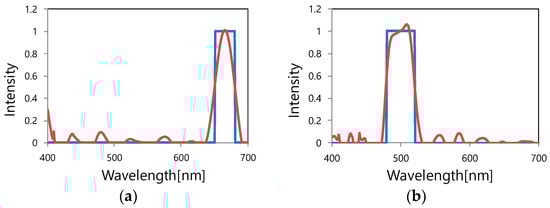 The calculation results are shown in Figure 6. As shown in Figure 6a,b, the peak positions of the designed spectrum and the reconstructed spectrum coincide with each other, and the bandwidths also substantially coincide. However, the sharp edges of the designed spectrum take rounded shapes like the Gaussian distribution in the reconstructed spectrum. This can be attributed to the coarse resolution because just 25 filters are provided across a wavelength range of 300 nm. It can be improved by increasing the number of filters. Moreover, as can be seen from Figure 6c,d, it is possible to calculate the results for multiple peaks. Figure 6d reveals that as the width of the designed spectrum becomes narrower, the peak position of reconstructed data is in good agreement with the designed peak position, but the peak intensity of the reconstructed spectrum decreases. These results suggest that optical spectra in a wavelength range of 400 to 700 nm can be obtained by using the proposed devices; however, there is room for improvement.