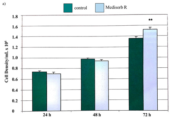 There was no difference between the cell proliferation capacity in the presence of the tested material and the control sample. It was found that Medisorb R has a positive influence on cell proliferation, as shown in Figure 7a, after 72 h.