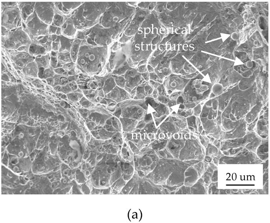 As shown in Figure 10, dimples and spherical structures appeared in the fracture surface of the SPT specimen, indicating cleavage fracture and ductile fracture, respectively. The mechanism involved microvoid nucleation (point a to b), cavity growth, the aggregation of adjacent cavities to form cracks (point b to c), and crack propagation resulting in the fracture (point c). The main source of the void nucleation was the difference in the physical properties of T2 copper and 45 steel. In particular, the thermal conductivity of T2 copper is much higher than that of 45 steel, resulting in a large amount of heat being biased to the copper side during the welding process. Thus, the copper-side growth increased seriously, and the grain size was coarse. The ductile–brittle transition temperature of the bi-material increased, resulting in a decrease of toughness. Consequently, this region became the weakest region. Meanwhile, coarse grain regions and a large void (defect) size both induced the formation of microscopic voids.