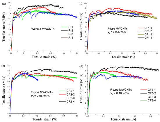 The direct tension test results are shown in Figure 5, and Figure 6 shows the direct–tension stress–strain curves of each group. From Figure 5, the initial cracking strength (σin) and ultimate tensile strength (σu) of the control group R were 6.5 MPa and 7.9 MPa, respectively. With the addition of MWCNTs, the initial cracking and ultimate tensile strengths of RPC improved significantly. For specimens with 0.025 wt.% F-MWCNTs, the initial cracking strength and ultimate tensile strength increased by 8.9% and 8.5%, respectively, and the ultimate strain reached 0.29%. Moreover, the initial cracking strengths of groups CF2, CF3, and CF4 were also enhanced to some degree. With the addition of 0.025 wt.% L-MWCNTs, the initial cracking strength and ultimate tensile strength increased by 16% and 11.4%, respectively. Uniaxial tensile stress–strain curves (Figure 6) showed that the initial cracking strain of each group was about 0.016%, and there was less differentiation between the specimens. However, the ultimate tensile strain of RPC with 0.025 wt.% L-MWCNTs and 0.2 wt.% F-MWCNTs was higher than other groups.