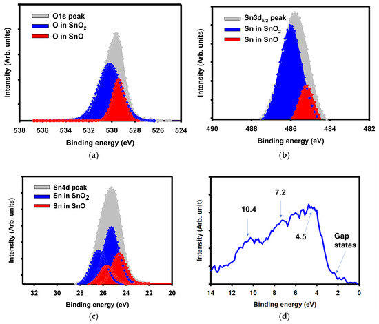 The electronic configuration of a-SnOx is shown in Figure 2. The O1s, Sn 3d5/2, Sn4d, and the valence band as measured by XPS are shown in Figure 2a–d. The deconvolution of the O1s follows the analysis used for tin oxide and not the conventional metal-oxide analysis [24,25,26]. The O1s peak in metal-oxides compounds are conventionally analyzed as having three parts: metal-oxygen, oxygen vacancies, and –OH groups. Here, the deconvolution of the O1s peak led to the knowledge of the phase composition of the film. The O1s can be deconvoluted into two peaks centered at 530.1 eV and at 529.4 eV. The separation of the two peaks by 0.7 eV indicates that the former was related to oxygen as in SnO2 while the latter was related to SnO [23,24]. The relative ratios of each component led to the presence of 72% of SnO2 and 28% of SnO. The O:Sn ratio was therefore 1.72. The deconvolution of the O1s peak into only two peaks is further justified by the analysis of the Sn3d5/2 peak.
