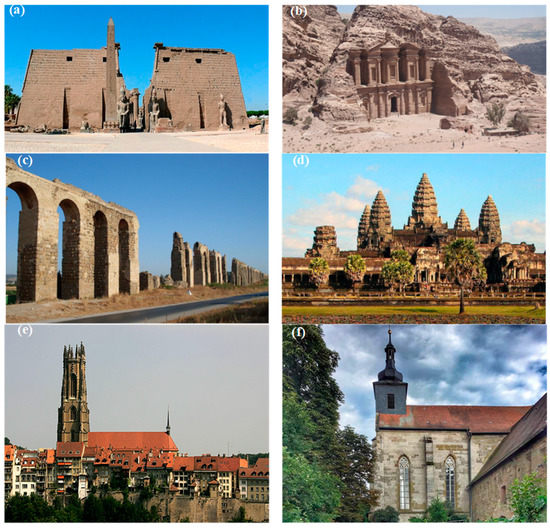 Sandstone monuments in the world. (a) Luxor temple in Tebas (Upper Egypt); (b) El Deir (“The Monastery”) in Petra (Jordan); (c) Carthage aqueduct in Tunisia; (d) Angkor Wat in Cambodia; (e) St. Nicolas Cathedral in Switzerland; (f) Birkenfeld Monastery in Germany; (g) Strozzi Place in Florence (Italy).