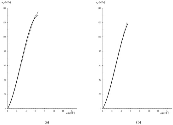 The comparison between experimental data of stress–strain curves and those obtained by the analytical expression of Equation (7) allows the assessment of the performance of the analytical model. Figure 7, Figure 8 and Figure 9, show experimental and analytical stress–strain curves. When comparing the curves in Figure 7, Figure 8 and Figure 9, a close fitting between the analytical and experimental results can be observed. The analytical expression is adequate for carrying out the description of the stress–strain behavior in the pre-peak hardening regime (Figure 7 and Figure 8). However, it can be observed that the analytical expression cannot predict the stress–strain behavior in the post-peak softening regime (Figure 9).
