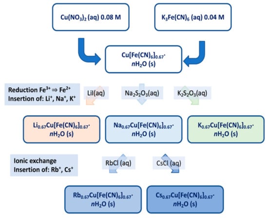 CsCu[Fe(CN)6]⋅nH2O was prepared by dropwise adding under stirring 200 mL of a solution with 0.5 M CsCl and 10 mM CuCl2 to a solution of 0.5 M of CsCl and 10 mM K3Fe(CN)6 at 50 °C []. A graphical illustration of the synthesis scheme is given in Figure 2.