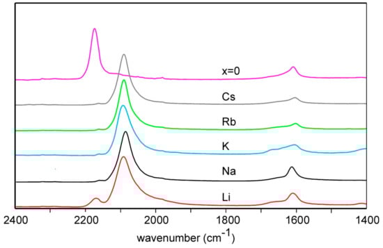 Recorded IR spectra for A2/3Cu[Fe(CN)6]2/3 with A = Li, Na, K, Rb and Cs and the nominally alkaline-free compound x = 0 are shown in Figure 3. The fraction of Fe3+ can be estimated from the integrated peak intensities at ~2093 cm−1 and at ~2178 cm−1, corresponding to C–N vibrations in Fe3+–CN–Cu2+ and Fe2+–CN–Cu2+, respectively []. The results show that the present K, Rb, and Cs samples contain essentially only Fe2+, the Na sample a small amount of Fe3+; 5(2)%, but that the Li sample contains a significant fraction of Fe3+, 17(2)%, tentatively attributable to a too short time for reduction of all Fe to Fe2+. The spectra shown for the x = 0 sample [], shows only Fe3+. The absence of Fe2+ in that sample was affirmed by a variety of techniques. Subsequent syntheses of x = 0 samples by us have, however, by IR shown a variety of Fe2+ fractions, ranging up to 50%. Significant amounts of Fe2+ in cation free [Fe(CN)6]2/3 samples was also reported by Pasta et al. [], who concluded that the pure Fe3+ compound can split water. IR spectra of water-containing Cu[Fe(CN)6]1/2 and KCu[Fe(CN)6]3/4 are shown in Supplementary Figure S7.