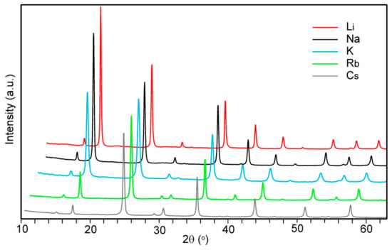 The corresponding Li and Na compounds were prepared similarly using LiI (Sigma Aldrich) (aq) and Na2S2O3 (Merck, Solna, Sweden (aq) as reducing agents and the Rb and Cs compounds by ion-exchange of the Na compound in solutions of RbCl (Merck) and CsCl (Merck), respectively, thus relying on the affinity of PBAs for heavy alkali metal ions. The samples were left under stirring for periods of time of 107 h for Li, 18 h for Na and K, 27 h for Rb and 92 h for Cs, then washed and centrifuged, and finally dried in ambient air.