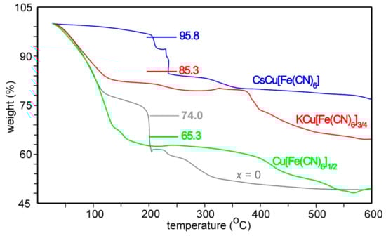 TG curves for water-containing Cu[Fe(CN)6]1/2 (green), KCu[Fe(CN)6]3/4 (red), CsCu[Fe(CN)6] (blue), and x = 0 (grey) samples upon heating in air at a rate of 10 °C/min.