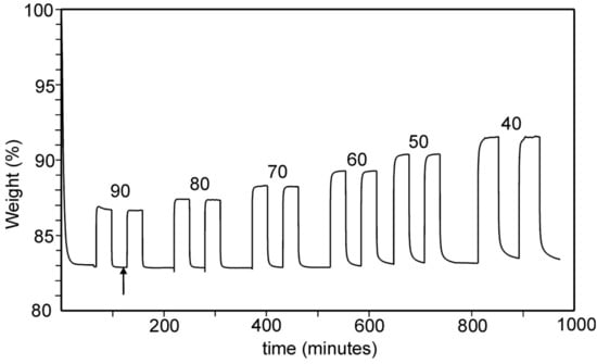 TG curves for adsorption/desorption of CO2 on Rb2/3Cu[Fe(CN)6]2/3 at indicated temperatures between 40 and 90 °C. The arrow indicates the point taken for calculation of the number n of water molecules per unit cell.