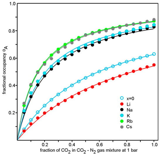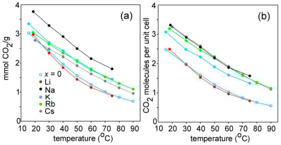 The adsorption capacities determined by TGA are shown in Figure 7, both in terms of mmol/g and as number of CO2 molecules per unit cell. The overall variation at any specific temperature is found to lie within a factor of 2, so the effect of the type of cation is not large, and the temperature variations are similar for all compounds. In terms of mmol CO2/g, the highest adsorption is exhibited by the Na compound, ~3.8 mmol/g at 20 °C. The K, Rb and Cs show similar values, while the Li and x = 0 compounds show lower values (above 40 °C). In terms of number of CO2 molecules per unit cell, the Na, K, Rb, and Cs compounds show similar values at room temperature, ~3.3, while Li and x = 0 show lesser values.