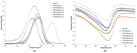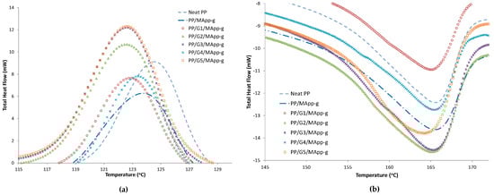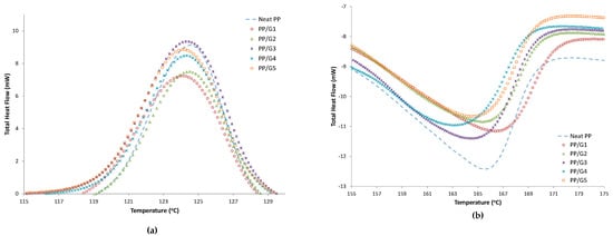 The thermal properties of the PP nanocomposites were evaluated as a function of graphene and compatibilizer loading. Figure 1, Figure 2 and Figure 3 show the DSC cooling and heating curves for PP/GNP, PP/GNP/PP-g-MA, and PP/GNP/POE-g-MA samples, respectively. All results are tabulated in Table 4, which presents the crystallization temperature (TC), the melting temperature (Tm), and the percentage of crystallinity (Xc) obtained from the DSC analysis results for all samples. As shown in Figure 1 and Table 3, increasing GNP loading has no significant influence on both crystallization and the melting temperature of PP. This means that the crystal size of PP had no change that could influence the melting temperature for higher GNP content. This could be attributed to the weak nucleation effects of the nanoplatelets for PP, and the tendency of the nanofiller to suppress crystal growth in the PP matrix, which limits the formation of more crystals []. However, a slight increase of the percent crystallinity of PP was observed with increasing GNP loading.