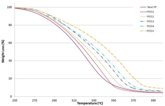 Thermal stability for all samples were investigated and studied with TGA analysis. All the results are shown in Figure 4, Figure 5 and Figure 6 and tabulated in Table 5. The onset temperatures (T20% and T50%) of 20% and 50% weight loss, respectively, were used as the indicator of the sample’s thermal stability. As shown in Figure 4 and Table 5, increasing the GNP loading has a significant influence on improving the thermal behavior of the nanocomposite, and showed higher thermal stability compared to neat PP. For instance, the onset temperature (T20% and T50%) values of neat PP were about 291 °C and 317 °C, respectively, while that of 5 wt.% GNP content were 306 °C and 346 °C, respectively. It is clearly shown that the incorporation of GNP into the PP matrix significantly improved initial thermal stability of PP. This is due to the prevention of the oxygen from the material, where GNP is acting as a barrier and the insulator improves the thermal resistance of the material and, as a result, increases the thermal stability of neat PP.