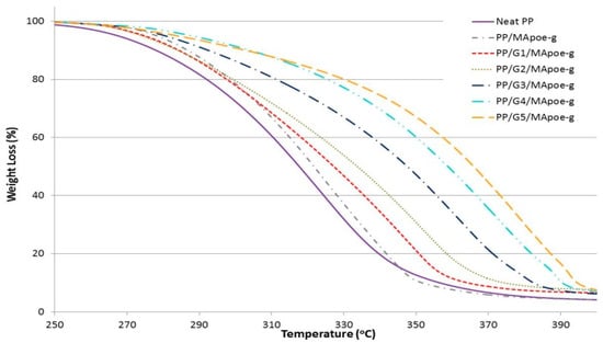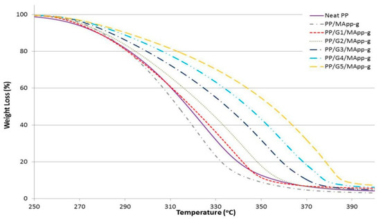 TGA curves for the second set of graphene nanocomposites with PP-g-MA.