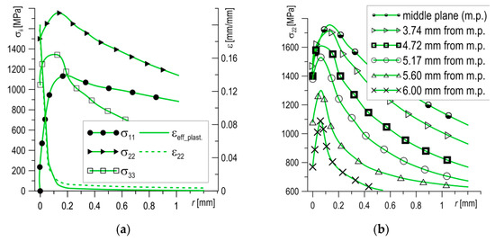 The stress σ22 distributions in parallel to the middle layers, from central to lateral planes, are presented in Figure 6b. The change of stresses σ22 in the thickness direction at some distance from the crack tip are shown in Figure 6c. Based on the data presented in Figure 6b,c, one can see that the stresses σ22 possess high values at a certain width and distance from the crack tip, but fall as they move away from the front of the crack, decreasing quickly at the lateral planes of the specimen.
