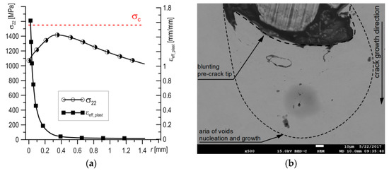 However, research shows that the relationship in Equation (5) describes the process of a void’s growth in certain ranges of εeff_plast and η. The development of a ductile fracture through nucleation, growth and joining of voids is possible when εeff_plast > 0.4, and the factor η is in the range of 0.7–1.0 (Table 2). When the SENB specimens were tested, this area was able to occur immediately before the top of the pre-crack. Similar ranges for sizes εeff_plast and η during ductile crack growth have also been obtained on specimens with other shapes [39,40].