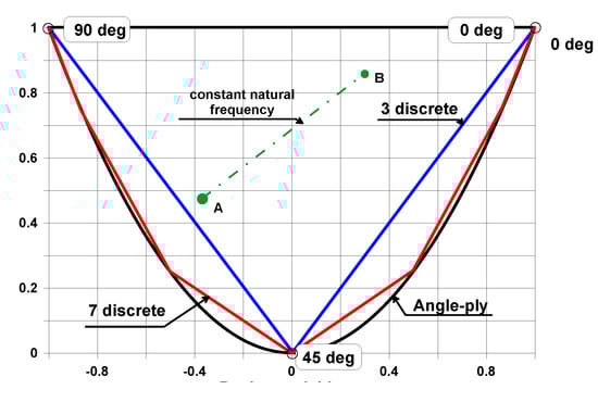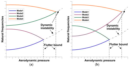 Usually, the flutter phenomenon is characterized by the plots of variations of natural frequencies with aerodynamic pressures—Figure 1. The neighborhood modes approach to each other at the value of the critical aerodynamic pressure that corresponds to the loss of stability. The values of the critical aerodynamic pressures are different for various vibrational modes. As it is shown in Figure 1 the mechanical (material) properties may change drastically both the pre-flutter and post-flutter behavior—the modes of frequency coalescence may be totally different for isotropic and anisotropic structures.