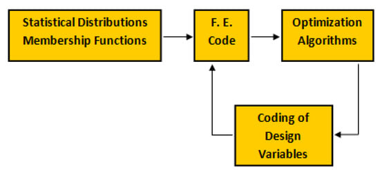 The above definition was introduced by Kirsch [] in 1989 and identical classification is presented in monograph [] published in 2002. The author of the cited works indicates that in many cases the problems are being solved, in which changes of topological, geometric, and dimensional variables are simultaneously made (see e.g., []) and such tasks are called lay-out optimization in English, which we think it is best to translate it as structure optimization. However, at the end of the 1980 s, Bendsøe [,] introduced the concept of topological optimization, which means also the changes in the material distribution in the structure. In monograph [], it is explained that in fact topological optimization is understood as the optimization of the material structure constituting the structure, in the sense of searching for the optimal material density ρ(x) associated with the mechanical properties of the material through the relation: