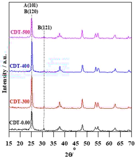 The crystallographic structure of TiO2 powders, obtained by thermal hydrolysis of an aqueous solution of Ti2(SO4)3, which was pre-oxidized by sodium nitrate in the presence of 1 mol L−1 glycine at pH 10 and then calcined at different temperatures (300, 400, and 500 °C), was investigated by XRD. The XRD patterns of CDT-0.00, CDT-300, CDT-400, and CDT-500 samples are displayed in Figure 1. The diffraction peaks of all samples showed mixed-phase titania of anatase and brookite. The peaks at 25.27° (101), 36.96° (103), 37.76° (004), 38.56° (112), 47.84° (200), 53.76° (105), 55.04° (121), 62.56° (204), and 68.64° (116) were well attributed to anatase-TiO2 (JCPDS No. 84-1286) [,]. Additionally, the formation of brookite TiO2 phase (JCPDS no.15-0875) could be confirmed by the peaks at 25.27° (120), 30.72° (121), 37.76° (201), 47.84° (231), 53.76° (320), 55.04° (241), and 68.64° (400) [,]. Although almost all brookite peaks overlapped with those of anatase, the most intensive brookite peak at 30.72° clearly indicated its presence. It should be pointed that brookite (metastable) is not a common titania polymorph, whereas anatase (metastable) and rutile (stable) have been frequently reported. Therefore, these results indicate the role of glycine, Na+, and pH value in the formation of anatase-brookite TiO2. It has been proposed that insoluble titanium hydroxide (Ti(OH)4) is firstly obtained by the direct hydrolysis of a mixture of aqueous Ti2(SO4)3 and NaNO3 [,,]. Then, by adding sodium hydroxide (to adjust pH to be 10) and glycine, the insoluble sodium titanate (Na2-XH2Ti2O5.H2O) and soluble five-membered ring complex [Ti(OH)x(C2H5NO2)y]z− are formed during the hydrothermal treatment [,,,,]. The sodium titanate is transformed into brookite at a high temperature in highly alkaline medium, whereas [Ti(OH)x(C2H5NO2)y]z− is transferred into anatase to obtain anatase-brookite heterojunction titania [,]. The content of the anatase and brookite phases were calculated using Zhang formula []. It was observed that an increase in calcination temperature resulted in a decrease in brookite content. Therefore, it was found that brookite was gradually converted to anatase over this temperature range (see Figure 1), and/or amorphous titania was transformed to anatase (as suggested by more intensive anatase peaks). Although some reports suggest the direct transition of brookite into rutile (not via anatase) [] and an accelerated anatase to rutile transition (starting at 500 °C) in the presence of brookite [], this study showed that the brookite presence does not necessarily cause fast and direct anatase-to-rutile transition (even at 500 °C). The Scherrer’s equation was applied to estimate the average crystallite size for the anatase and brookite phases from the broadening of peaks 25.27° (120) and 30.72° (121), respectively (see Table 1) []. Clearly, both anatase and brookite crystallite sizes showed a typical upward trend with increasing calcination temperature. The change in phase structure and particle size of TiO2 with increasing calcination temperature is corroborated by some previous reports [,,]. For example, Allen et al. studied the influence of calcination temperature on the morphology (crystalline phase and size) and photocatalytic performance of TiO2. They noticed a similar trend for the calcination of anatase-brookite TiO2 samples, where anatase content increased gradually with increasing temperature, in contrast to the decrease in brookite content. Moreover, the crystal size of anatase and brookite increased with increasing calcination temperature [].