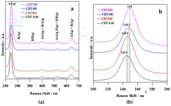 (a) Raman spectra of CDT-0.00, CDT-300, CDT-400, and CDT-500 samples; and (b) enlargement of the main peak around 145 cm−1.