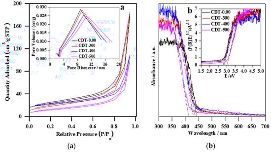 Figure 4a shows the nitrogen adsorption–desorption isotherms and pore-size distribution (inset) of CDT-0.00, CDT-300, CDT-400, and CDT-500 samples. It was found that all TiO2 samples exhibited IV-type isotherm according to IUPAC classification, proving the formation of a mesoporous structure [,]. The broad hysteresis loops (0.35–0.96 P/Po) for CDT-0.00 and CDT-300 samples and narrow ones (0.53–0.96 P/Po) for CDT-400 and CDT-500 samples indicate that thermal treatment caused a shift for hysteresis loops to higher relative pressure, and this might correlate with the gradual loss of mesoporous structure with increasing temperature []. Moreover, it should be mentioned that, with increasing temperature, the particle and pore sizes of the TiO2 photocatalyst increased, resulting in narrowing the hysteresis loops because the large particles could be considered as irregular voids []. Additionally, it must be pointed that thermal treatment influenced all surface properties, e.g., pore sizes increased from 8.6 to 10.7 nm, whereas pore volume and specific surface area decreased from 0.29 to 0.23 cm3 g−1 and 72.4 to 20.5 m2 g−1, respectively, by thermal treatment at 500 °C (as summarized in Table 1). Figure 4b presents the diffuse reflectance spectra and band gap estimations (inset) of as-prepared and calcined TiO2 photocatalysts. The increase in calcination temperature resulted in the hypochromic effect, i.e., shift of the absorption edge towards shorter wavelengths, demonstrating the broadening of the band gap (from 2.79 to 3.00 eV), as shown in Figure 4b and Table 1. Generally, brookite shows broader bandgap than anatase, ca. 3.3 eV, but the modification resulted in bandgap narrowing; however, temperature again caused an increase in the band gap. Accordingly, it is proposed that, by applying the thermal treatment, the non-metal elements released gradually, hence the visible light response of the samples was diminished, resulting in redshift of absorption edge and broadening of band gap, similarly to previous reports [,].
