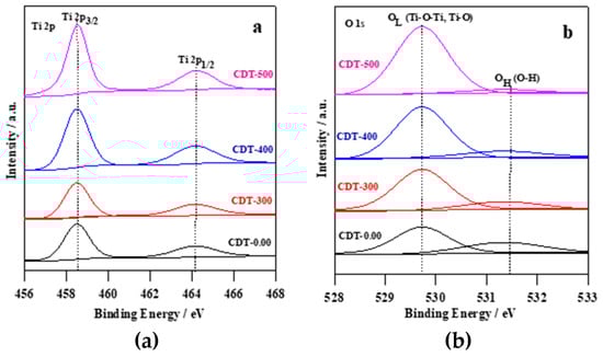 XPS detailed scans in the energy regions of: (a) Ti 2p; and (b) O 1s of all samples.
