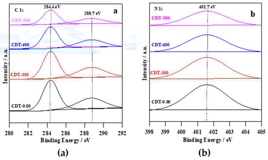 XPS detailed scans in the energy regions of: (a) C 1s; and (b) N 1s of the obtained photocatalysts.